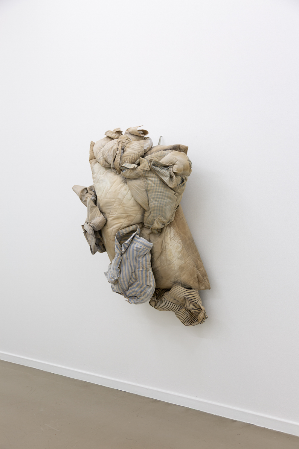 Det er noe veldig menneskelig ved det. Det slitte og møkkete. Jeg er også opptatt av dette med vask og renslighet i sammenheng med psykisk sykdom. Det er veldig fort at det med renslighet blir for vanskelig for syke folk, det er slitsomt å opprettholde hygienen. Hvis du ikke klarer, holder deg ren har du mistet kontrollen og havner utenfor samfunnet. Det er litt som med rot. Du trenger ikke å rote hjemme, det skjer av seg sjøl, det er den der ryddinga du må jobbe med. Det skal sies at jeg farger tekstilene med kaffe for å gi de et enda mer møkkete uttrykk.
